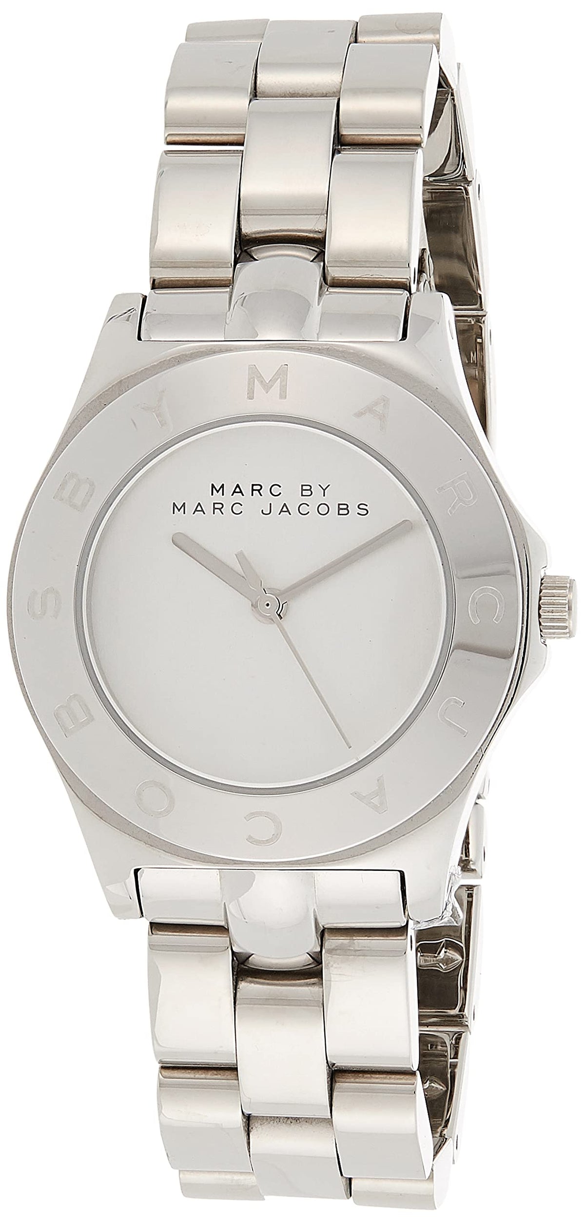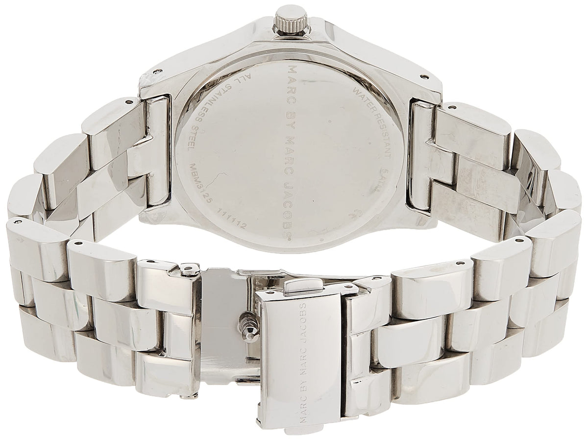 Stainless steel case with a stainless steel bracelet. Fixed stainless steel bezel. White dial with silver-tone hands. No markers. Dial Type: Analog. Quartz movement. Scratch resistant mineral crystal. Pull / push crown. Solid case back. Case diameter: 36.5 mm. Case thickness: 10 mm. Round case shape. Band width: 18 mm. Deployment clasp with push button release. Water resistant at 30 meters / 100 feet. Functions: hour, minute, second. Casual watch style. Marc by Marc Jacobs Blade White Dial Stainless Steel Ladies Watch MBM3125.