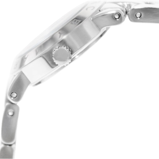 Stainless steel case with a stainless steel bracelet. Fixed stainless steel bezel. White dial with silver-tone hands and crystal hour markers. Arabic numerals mark the 3, 6, 9 and 12 o'clock positions. Dial Type: Analog. Quartz movement. Scratch resistant mineral crystal. Pull / push crown. Solid case back. Case diameter: 26 mm. Case thickness: 9 mm. Round case shape. Fold over clasp with a safety release. Water resistant at 30 meters / 100 feet. Functions: hour, minute, second. Casual watch style. Marc by Marc Jacobs Mini Amy White Dial Stainless Steel Ladies Watch MBM3055.