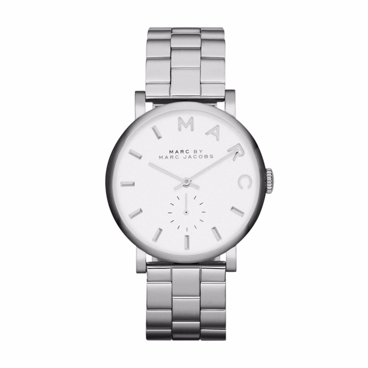 Case diameter: 36.5 mm. Case thickness: 8.2 mm. Round case shape. Band width: 18 mm. Fold over clasp with a safety release. Water resistant at 50 meters / 165 feet. Functions: hour, minute, small second. Casual watch style. Marc by Marc Jacobs Baker White Dial Steel Ladies Watch MBM3242.