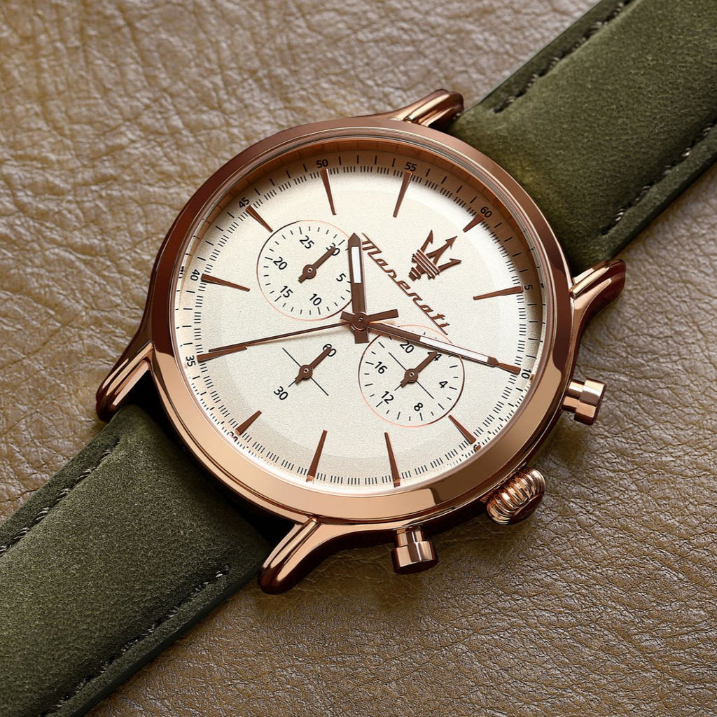 Elevate your style with the Maserati Epoca Chronograph Watch for men. This sleek timepiece features a white dial and black leather strap, making it both fashionable and versatile. With precision chronograph movement, you'll always be on time. Perfect for the modern man who appreciates luxury and sophistication.