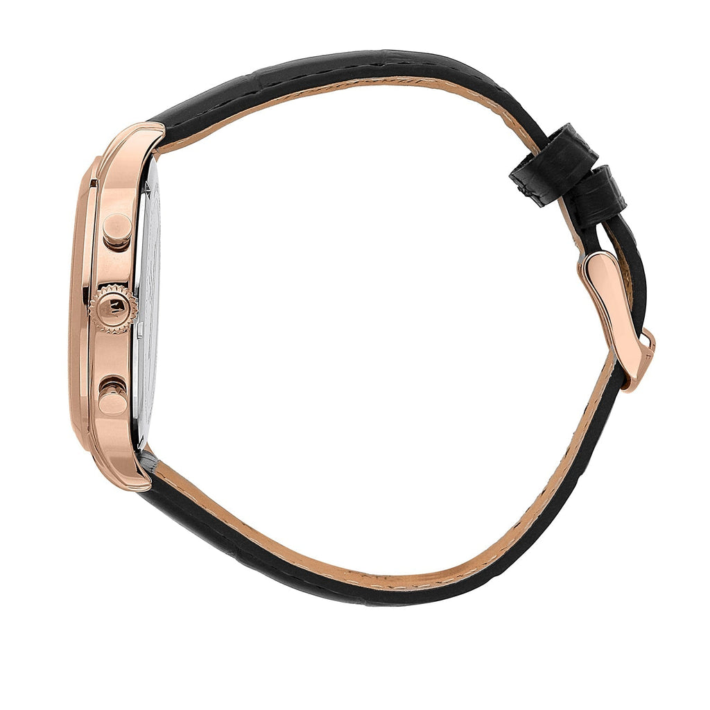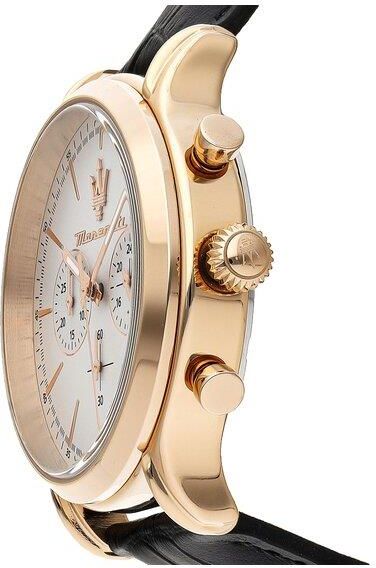 The elegant Maserati Epoca Chronograph R8871618016 men's watch operates with a Japanese Miyota JS20 quartz movement. The construction of the model consists of a black calfskin leather strap, a pink-gold stainless steel envelope and a white dial protected by hardened mineral glass. The dial features a sub-dial for daylight saving time, a chronograph and luminescent-coated hands. A screw-down crown and caseback, as well as 100 meters of water resistance protect the case interior during surface swimming.