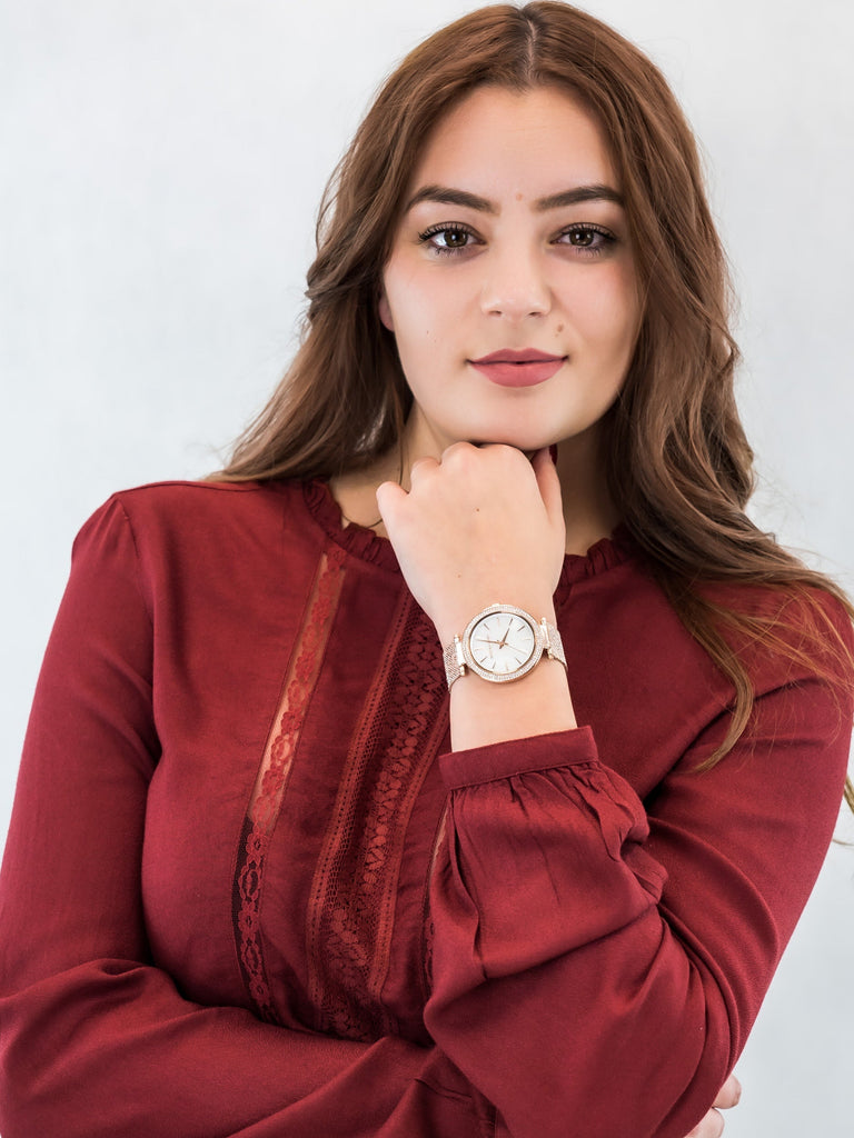 The Darci collection features a delicately sophisticated look and ring accents in the form of encrusted crystals. It is made of stainless steel for the case and chain, mineral crystal for the glass and has an analog luminous mother-of-pearl display. Decoration of encrusted crystals on the ring giving the model an extremely glamorous look. Full rose gold color finish. Diameter 39 mm, thickness 7 mm, chain width 20 mm. Water resistance: 5 ATM - heavy wetting is not recommended, light splashes are allowed.