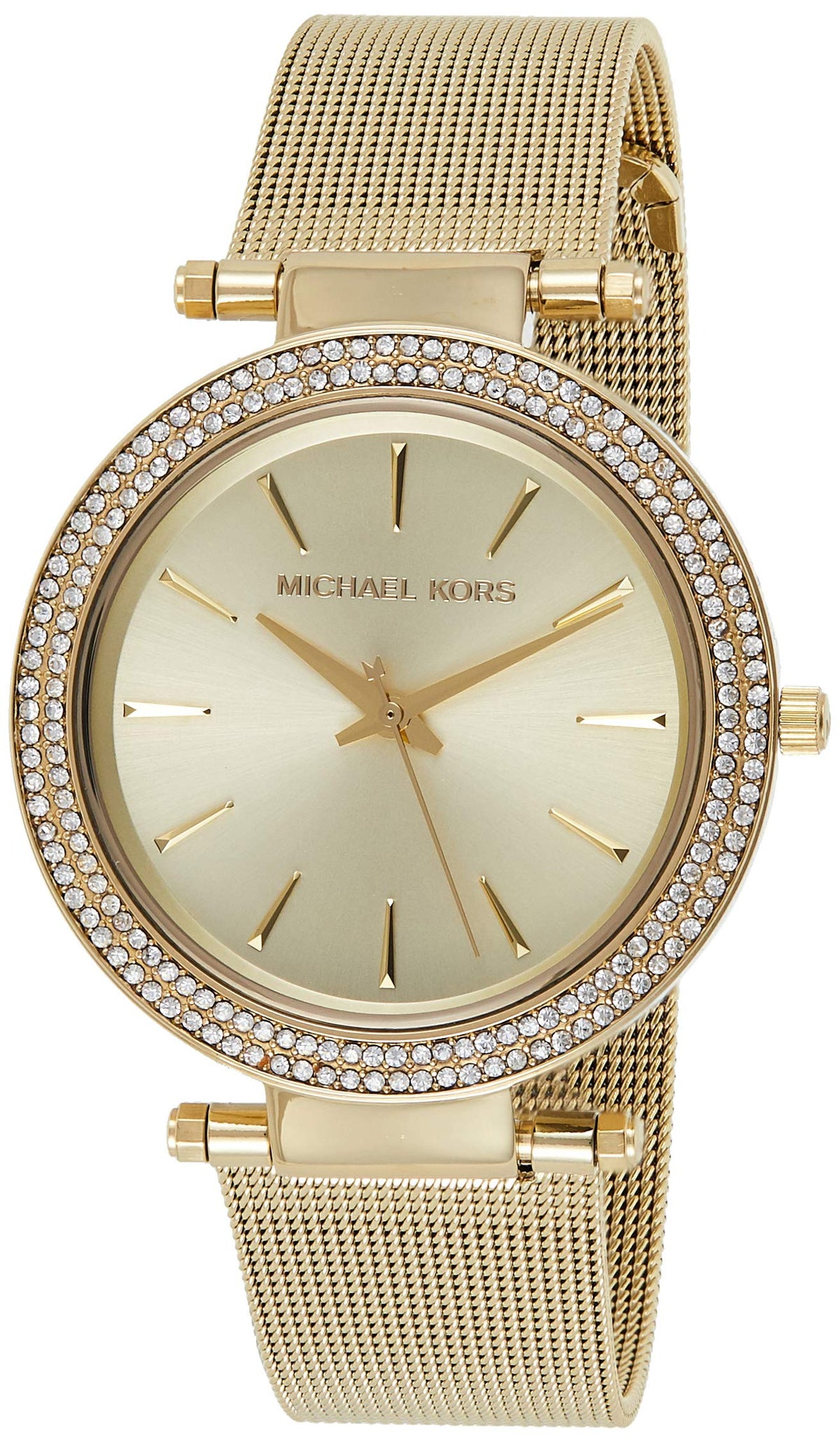 A sleek mesh strap makes this gold-tone stainless steel Michael Kors watch a chic wardrobe essential-especially with a matching sunray dial and glitz topring.