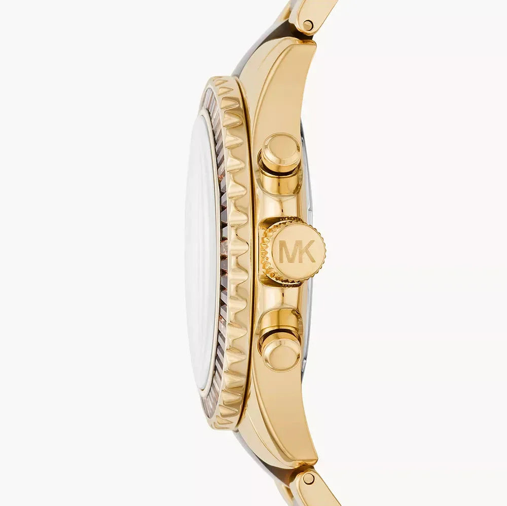 Michael Kors' 42mm Everest watch features a chocolate sunray dial, gold-tone case with chocolate baguette topring, chronograph movement and gold-tone stainless steel bracelet with tortoise acetate center links.