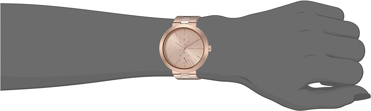 A minimalist circular brushed multifunction dial gives a modern feel to the rose gold-tone Michael Kors Garner watch. The sleek look is finished with a brushed case and bracelet with polished-and-brushed links.