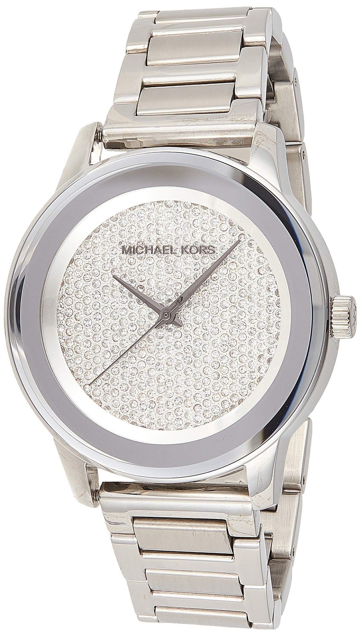 Stainless steel case with a stainless steel bracelet. Fixed stainless steel bezel. Diamond pave dial with black hands. No markers. Dial Type: Analog. Quartz movement. Scratch resistant mineral crystal. Pull / push crown. Solid case back. Case size: 41.5 mm. Case thickness: 10 mm. Round case shape. Band width: 17 mm. Deployment clasp. Water resistant at 50 meters / 165 feet. Functions: hour, minute, second. Casual watch style. Michael Kors Kinley Diamond Pave Dial Men's Watch MK5996.