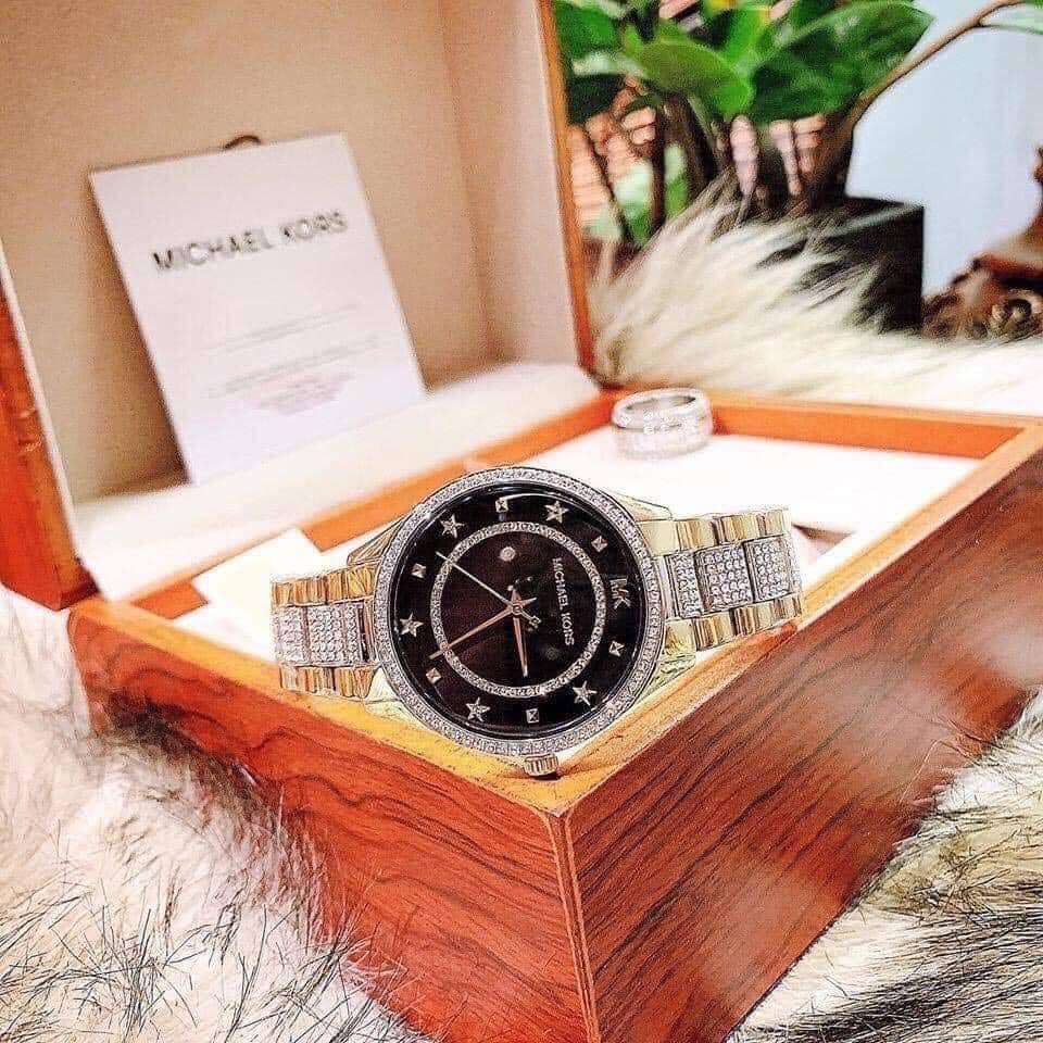 A study in timeless glamour, MK's Lauryn watch is designed in gleaming two-tone stainless steel with stars and squares instead of numeral indexes. The bracelet strap and bezel are lined with sparkling pavé crystals for a brilliant effect.