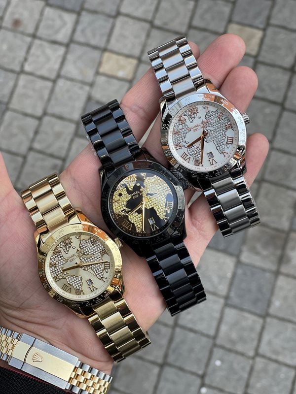 Watch featuring round dial with sparkling map design, date window at 6 o'clock, and Roman numeral markers