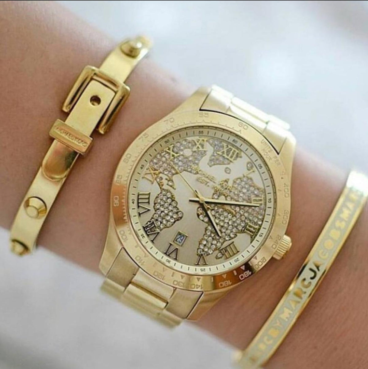 Gold-tone stainless steel case and bracelet. Fixed gold-tone bezel showing tachymeter markings. Pave-embellished dial with an engraved map with gold-tone hands and Roman numeral hour markers. Minute markers around the outer rim. Dial Type: Analog. Date display at the 6 o'clock position. Quartz movement.