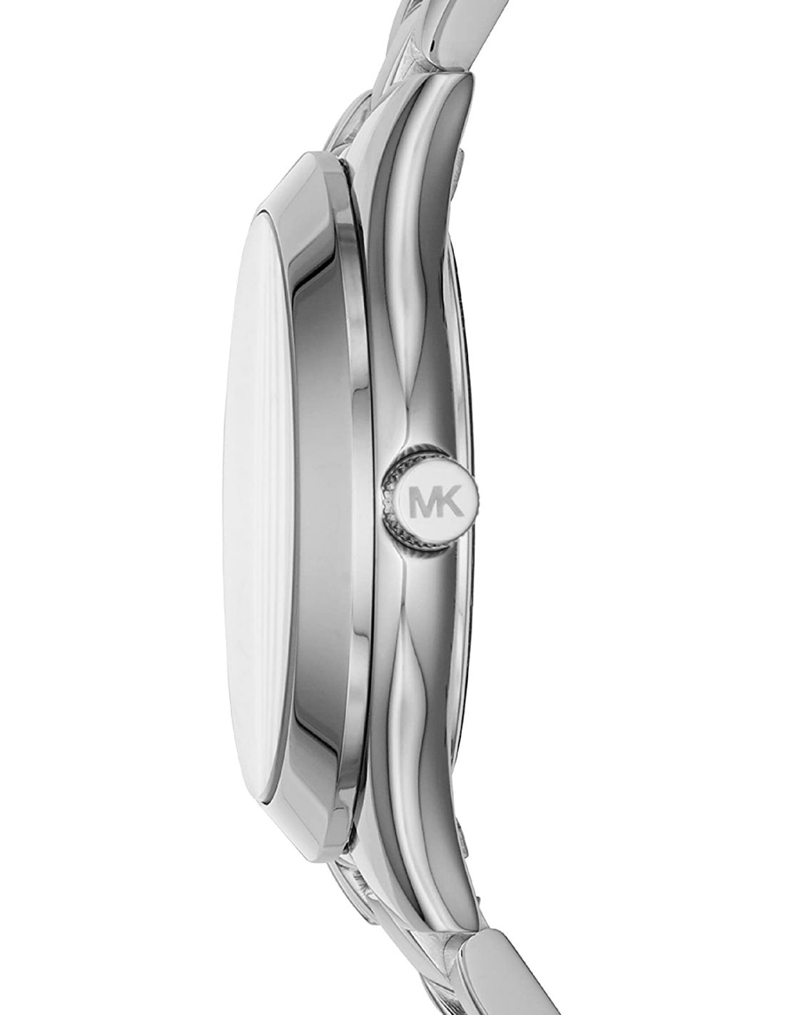 Stainless steel case with a stainless steel bracelet. Fixed stainless steel bezel. Silver crystal-set dial with silver-tone hands. No markers. Dial Type: Analog. Quartz movement. Scratch resistant mineral crystal. Pull / push crown. Solid case back. Case size: 33 mm. Case thickness: 8 mm. Round case shape. Band width: 18 mm. Deployment clasp with a push button release. Water resistant at 50 meters / 165 feet. Functions: hour, minute, second. Casual watch style. Michael Kors Mini Slim Runway Silver Dial Ladies Watch MK3548.