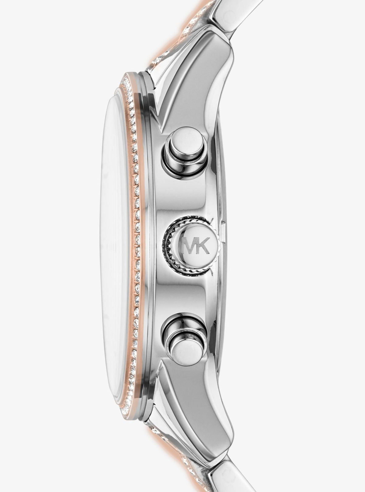 This 37mm Ritz watch features a silver sunray dial with rose gold-tone crystal-embellished stick indexes, glitz topring, chronograph movement and two-tone pavé bracelet.
