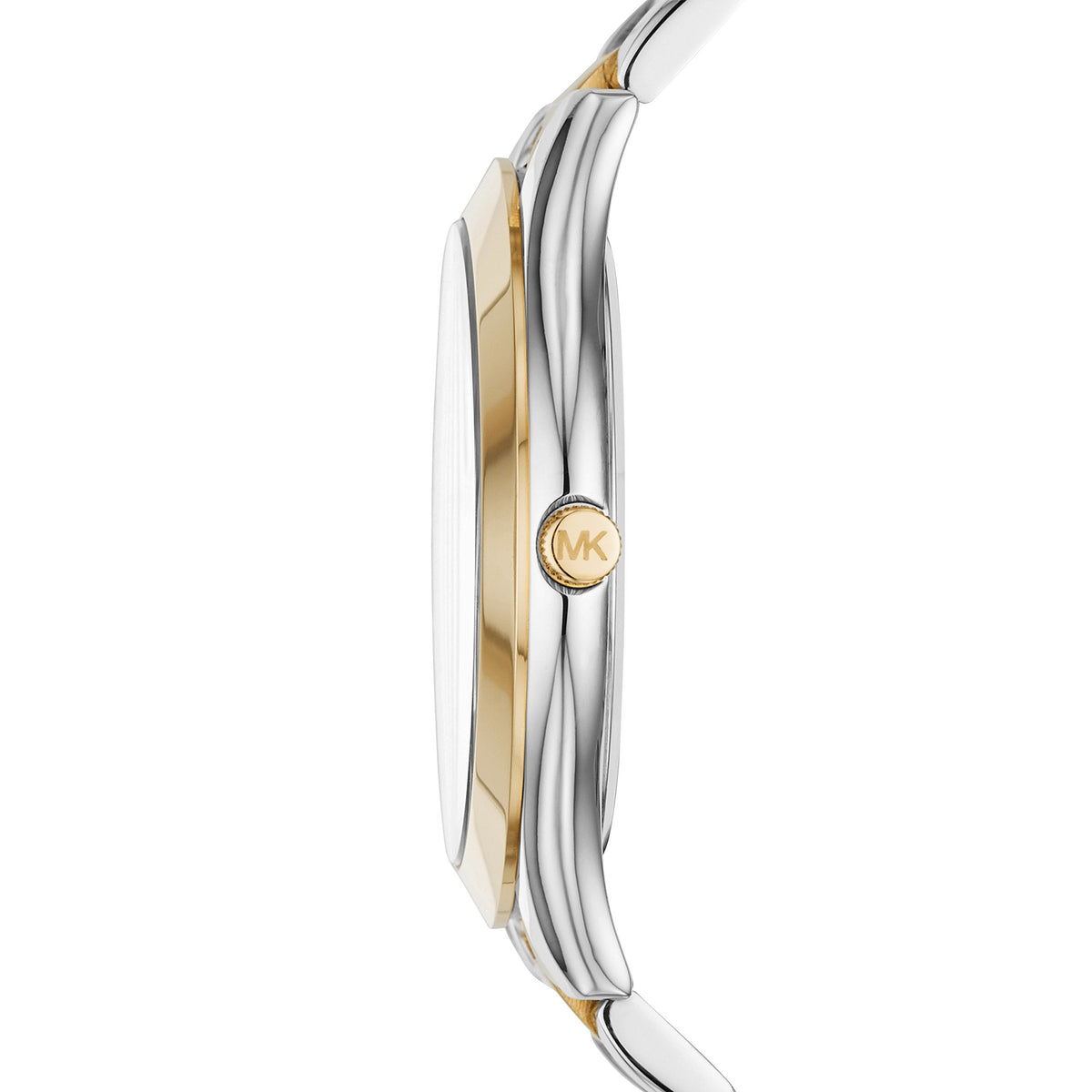 Stainless steel case with a two-tone (silver and gold-tone) stainless steel bracelet. Fixed gold-tone bezel. Blue dial with gold-tone hands and index hour markers. Dial Type: Analog. Quartz movement. Scratch resistant mineral crystal. Pull / push crown. Solid case back. Case diameter: 42 mm. Case thickness: 8 mm. Round case shape. Band width: 12 mm. Deployment clasp. Water resistant at 50 meters / 165 feet. Functions: hour, minute, second. Dress watch style. Michael Kors Slim Runway Blue Dial Two-tone Ladies Watch MK3479.