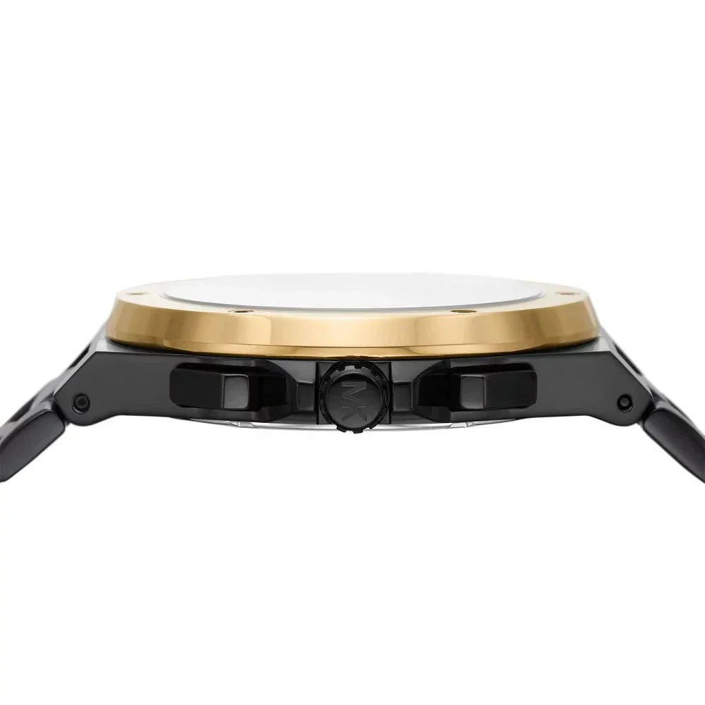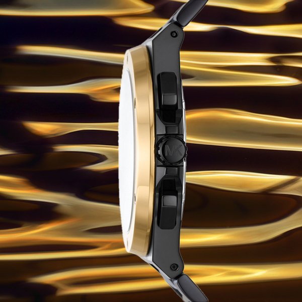 Introducing the men's Lennox: a bold sport watch with screw detailing on the topring. With a black dial and gold-tone topring on a black-tone stainless steel bracelet, this 45mm watch is the perfect everyday timepiece.