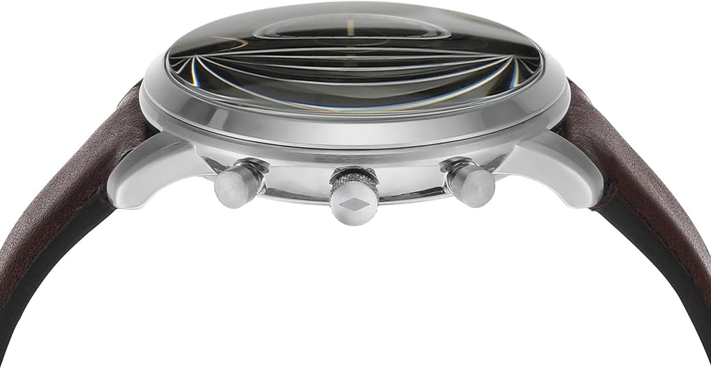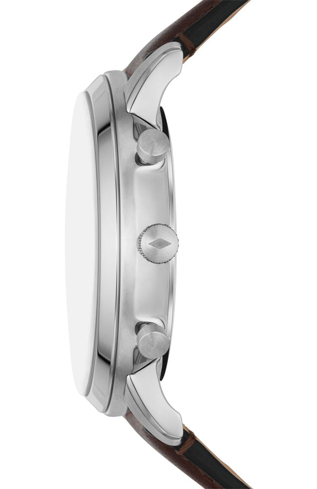 Timeless elegance is crafted in every tick with this watch from the Neutra collection by Fossil. Housed in a 44 mm case, the dial is shielded with mineral glass and runs on a quartz movement. It is water resistant up to 50 m and is ideally suitable for men. The timepiece features a uni-directional bezel. Inspired by architecture with its simple proportions and symmetry, this functional watch is refined and versatile. It features an updated numeral font, sunray dial, strap with lining and subdials for 24-hour time and stopwatch.