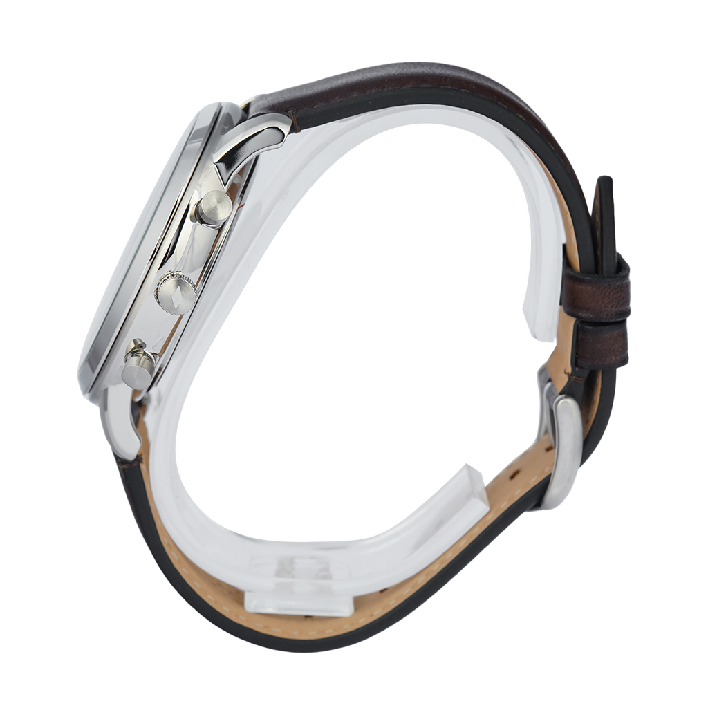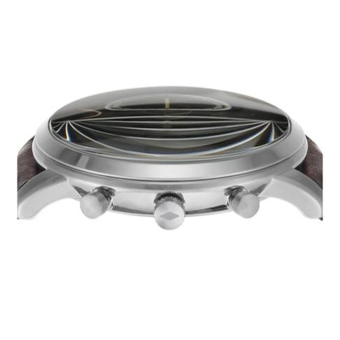 Inspired by architecture with its simple proportions and symmetry, this functional Neutra Chronograph is refined and versatile. It features an updated numeral font, stainless steel case, brown sunray dial, brown leather strap with nubuck lining and subdials for 24-hour time and stopwatch.