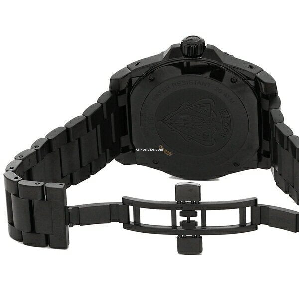 Case size: 45 mm. Case thickness: 12 mm. Round case shape. Bracelet width: 22 mm. Deployment clasp. Water resistant at 200 meters / 660 feet. Functions: date, hour, minute, second. Luxury watch style. Gucci Dive Black Dial Stainless Steel Men's Watch YA136205.