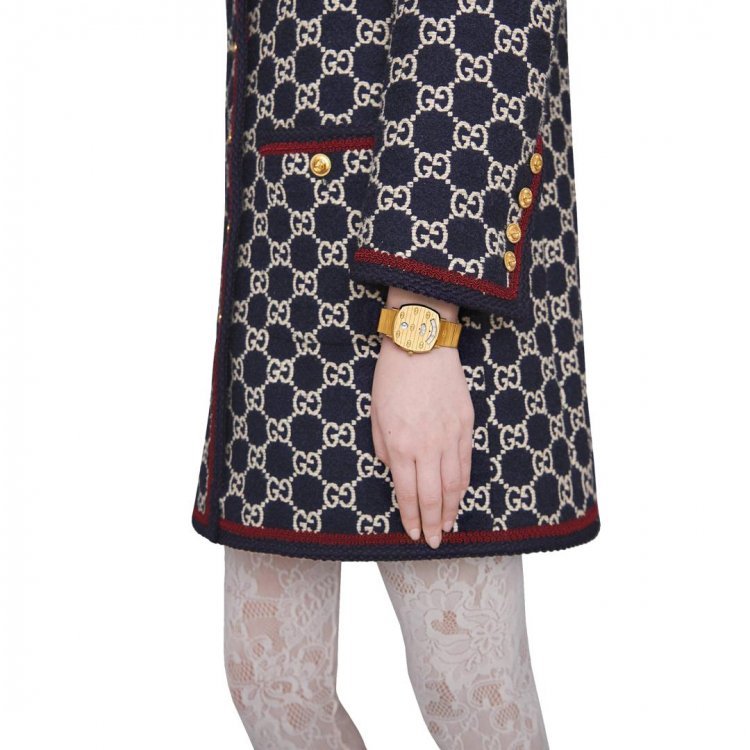 The Stainless Steel Yellow PVD dial features three windows for hour, minute and date display and is finished with sapphire crystal glass and signature Gucci interlocking G motifs. This 70's retro styled watch features a stainless-steel Yellow Gold PVD bracelet strap with folding clasp fastening. Powered by a Swiss-made quartz movement, this unconventional 35mm watch is also water resistant up to 30 metres. Complete with Gucci presentation packaging and a 2 year international warranty