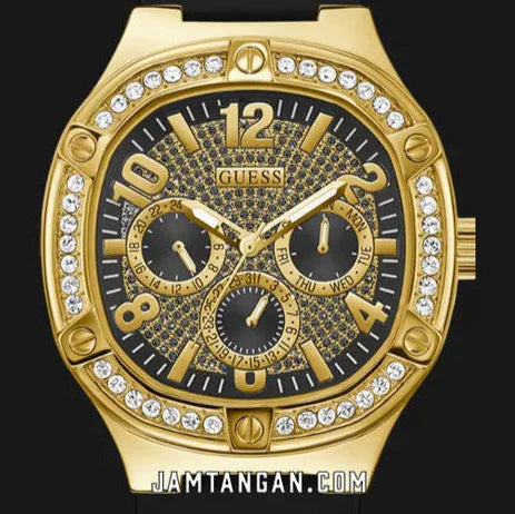 Guess Duke GW0641G2 is a timepiece with a golden stainless steel envelope, in which is set a dial complemented with a date of the month, weekday and daily time. The model is decorated with crystals, and the whole is complemented by a black silicon strap. The whole to work is powered by a quartz mechanism.