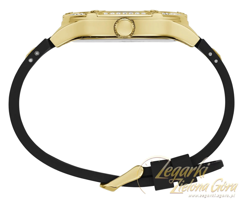 One of the standout features of this watch is its polished gold tone case with crystals, which adds a hint of glamour and sparkle. The sunray black glitz multifunction dial further enhances its sophisticated appeal. The black silicone strap with glitz insert not only provides comfort but also adds an element of style.