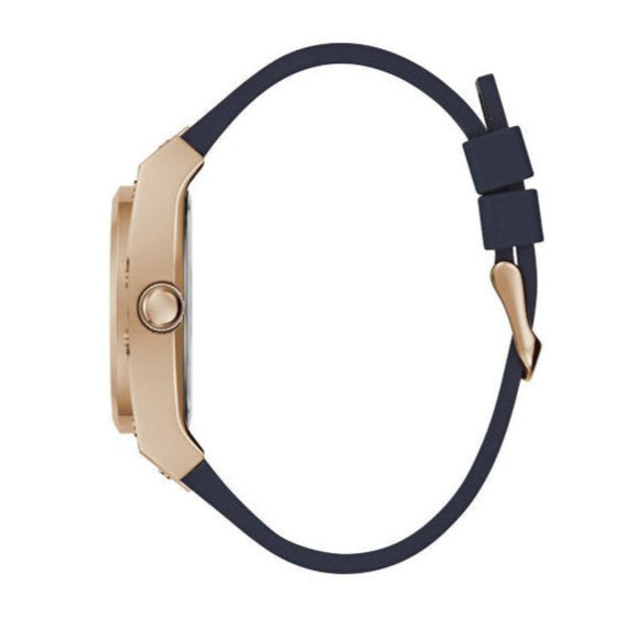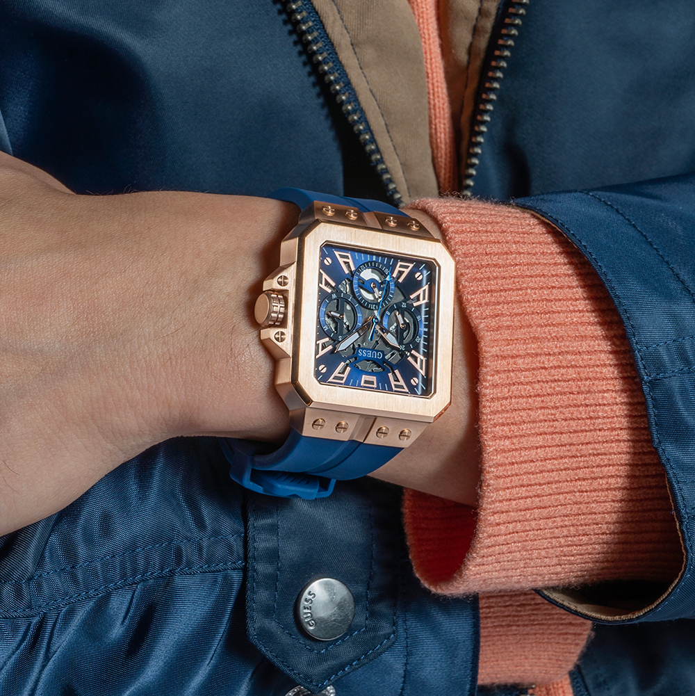 Elevate your personal style with the Guess Prodigy GW0569G3, a watch that seamlessly merges contemporary refinement with athletic charm. Mesmerize with the dual-tone sunray dial, which catches and reflects light, lending a touch of grace to your elegance. Complemented by a striking blue silicone strap, this watch makes a statement no matter where you go - whether it be to work, out with friends, or to a special event.