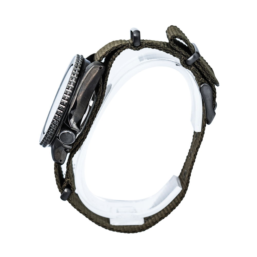 This timepiece comes equipped with a military green fabric NATO style strap. The strap fastens through the use of a standard metal Seiko-signed buckle that secures the watch around the wrist.