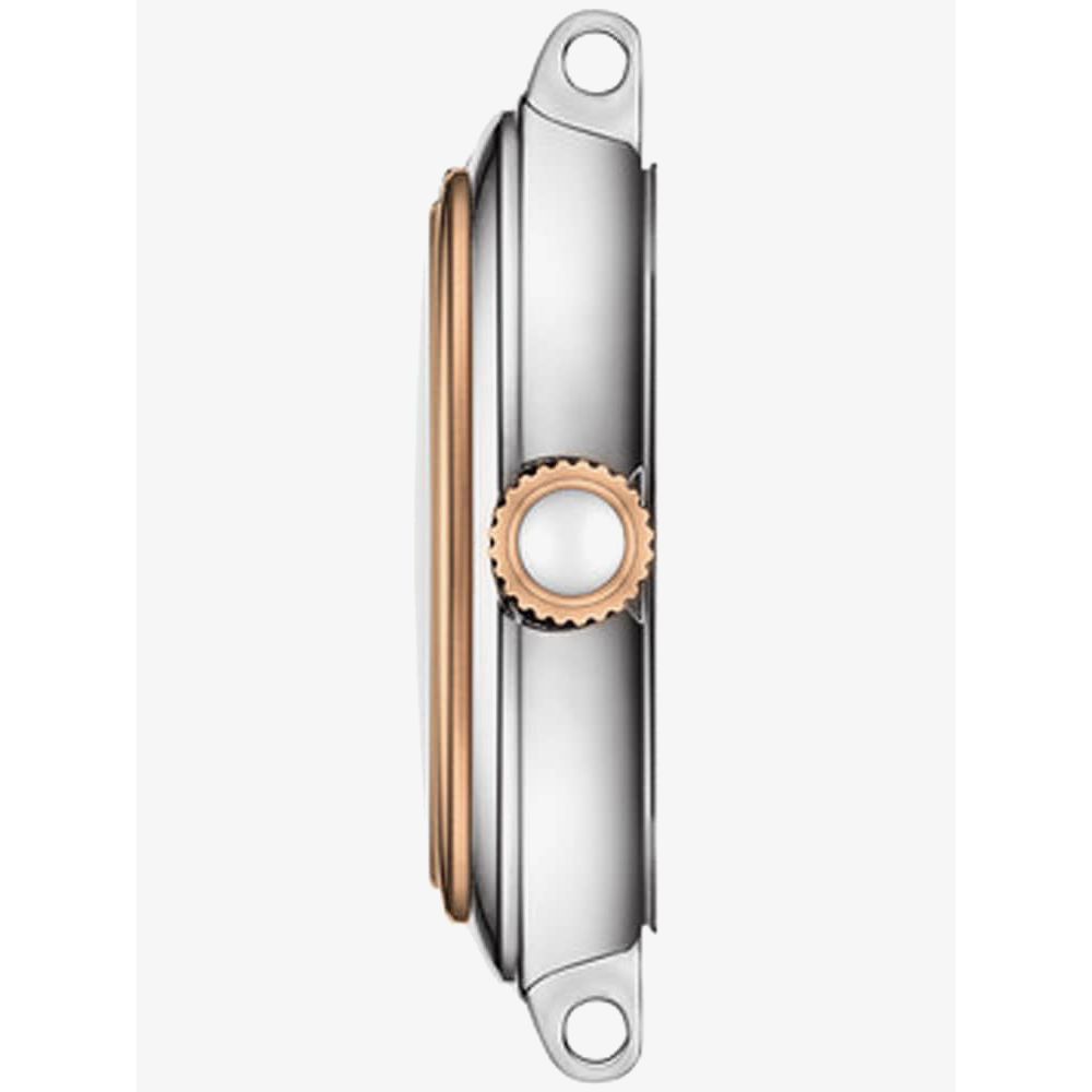 Classic designs don’t come more timeless than the Bellissima Small Lady. The round case and five link bracelet are made of steel, with highlights in warm rose gold PVD that give the watch its luxurious feel and day to night versatility. The watch has a silver Roman numeral dial with a beautiful rose shaped guilloché pattern, while a final flourish is the dazzling white ceramic cabochon set into the crown. With these elegant details, the Bellissima Small Lady will remind her you love her every day.