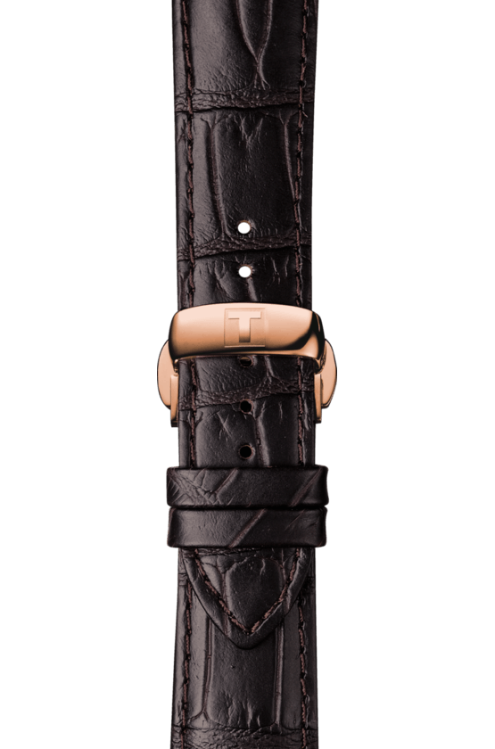 Rose gold PVD stainless steel case with a brown leather strap. Fixed rose gold PVD bezel. Silver dial with rose gold-tone alpha-style hands and index hour markers. Roman numerals mark the 3, 6, 9 and 12 o'clock positions. Minute markers around an inner ring. Dial Type: Analog. Date display at the 6 o'clock position. Tissot calibre Powermatic 80 (C07.111) automatic movement, based upon ETA 2824-2, containing 23 Jewels, bitting at 21600 vph, and has a power reserve of approximately 80 hours. Scratch resistant sapphire crystal. Pull / push crown. Transparent case back.