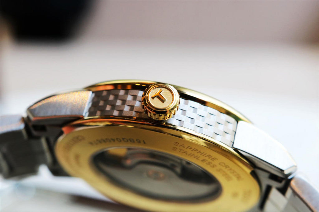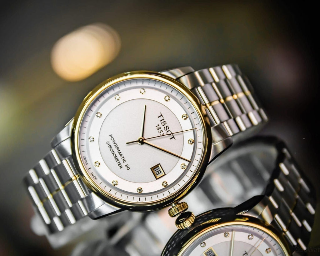 Brand New Authentic Tissot T-Classic Luxury Automatic Diamond Dial Two-Tone Men's Watch Model T086.408.22.036.00. Stainless Steel with Gold Tone case with Stainless Steel with Gold Tone watch band. Dial description: Silver with Diamond Hour Markers dial. Silver dial. Automatic Self Winding movement. Scratch Resistant Sapphire crystal. Case size: 41mm. Case thickness: 9.75mm. Transparent case back. 50 Meters/ 150 Feet water resistant. 2 year warranty. Also known as model: T0864082203600, T086-408-22-036-00