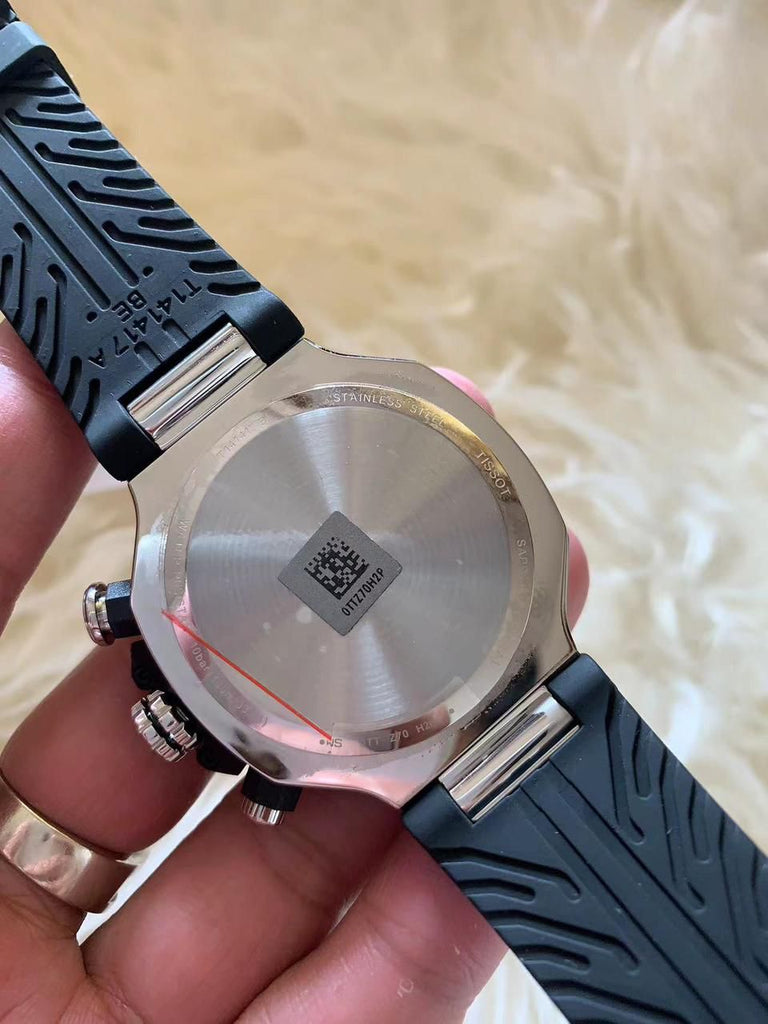 Chronograph sub-dials display: 1/10th of a Second, 60 Second, 30 Minute. Powered by G10.212 engine. Watch functions: Date, Hour, Minute, Second, Chronograph. Scratch Resistant Sapphire crystal. Round case shape. Case size: 45mm. Case thickness: 11.8mm. Solid case back. 100 Meters - 330 Feet water resistant. 2 year warranty. Also known as model: T1414171701100.