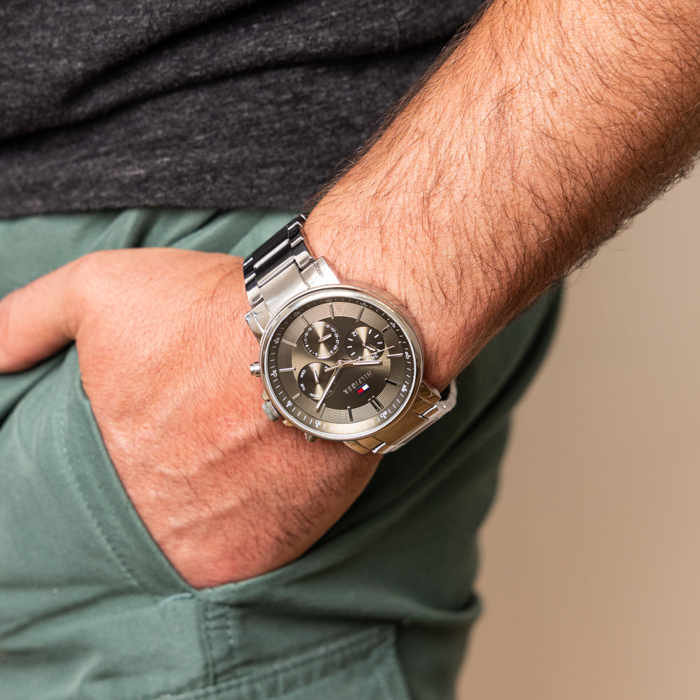 The Tommy Hilfiger Tyson collection ranges a selection of functional and handsome timepieces, powered with a quartz multi-functional movement this watch not looks great but works seamlessly. This Tyson 1710587 model is designed with a stainless-steel case and bracelet, paired with a sage green dial and 50 meters water resistant this watch is suitable for everyday wear.