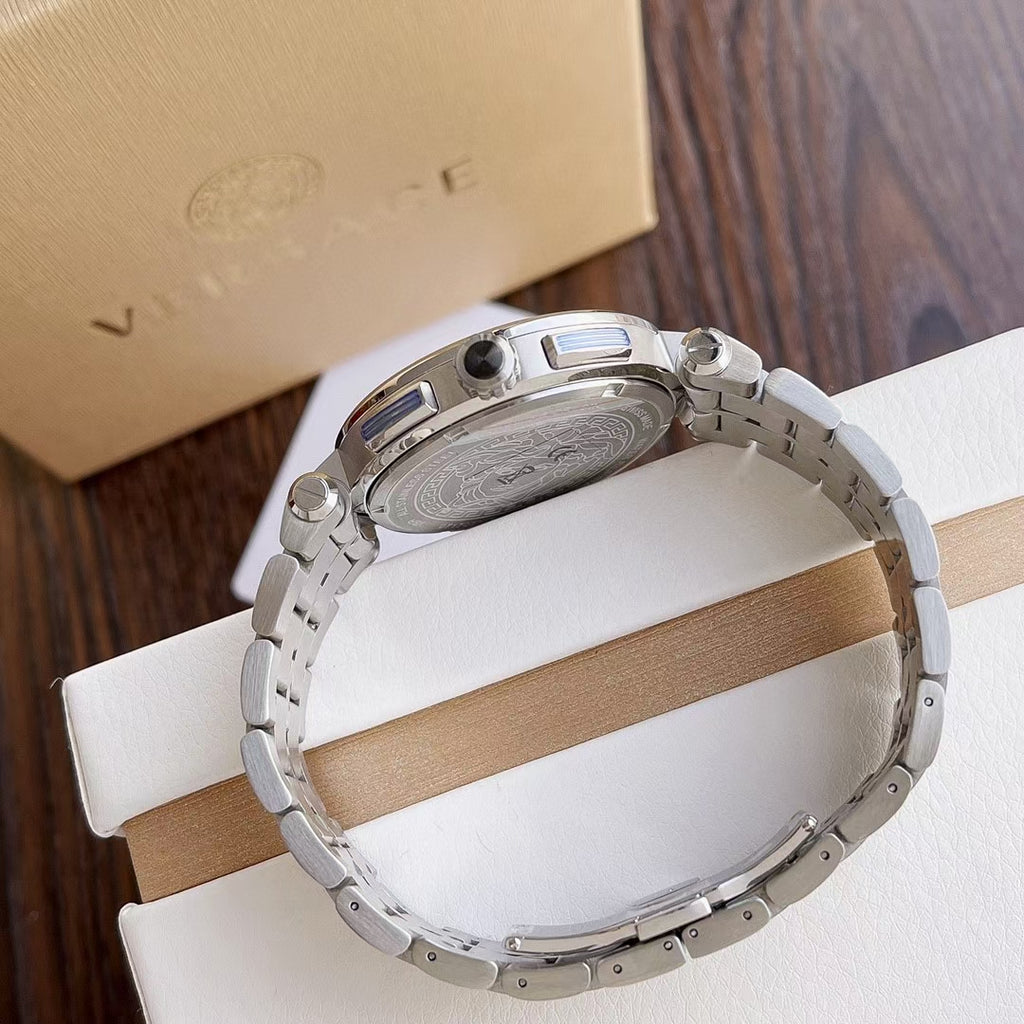 Experience luxury and elegance with the Versace Aion Chronograph Watch for Men. Boasting a sleek black dial and silver steel strap, this watch exudes sophistication. The chronograph feature allows for precise timekeeping while making a stylish statement. Elevate your style with Versace's timeless design and impeccable craftsmanship.