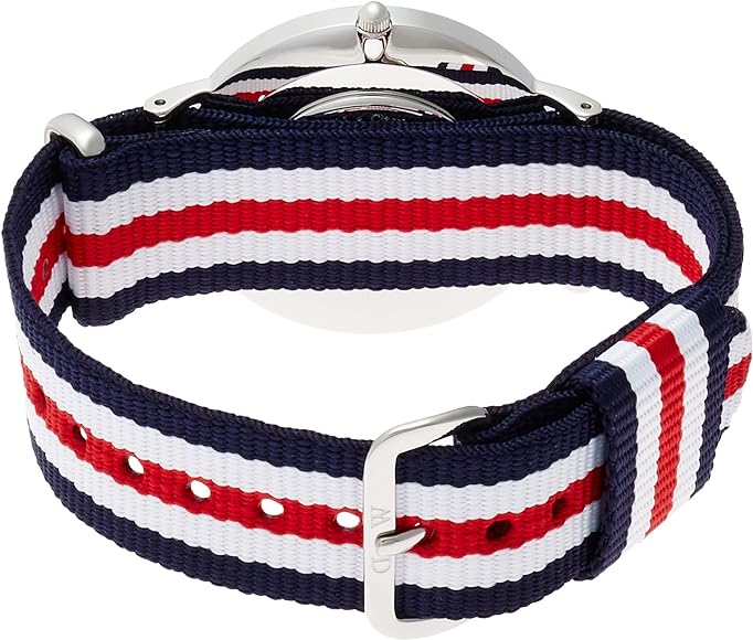 Clock Daniel Wellington collection Classic template Canterbury DW00100051. 36mm case in silver steel (6mm thickness), white dial. 18mm NATO strap in white, red and blue fabric. Water resistant up to 3 atm.