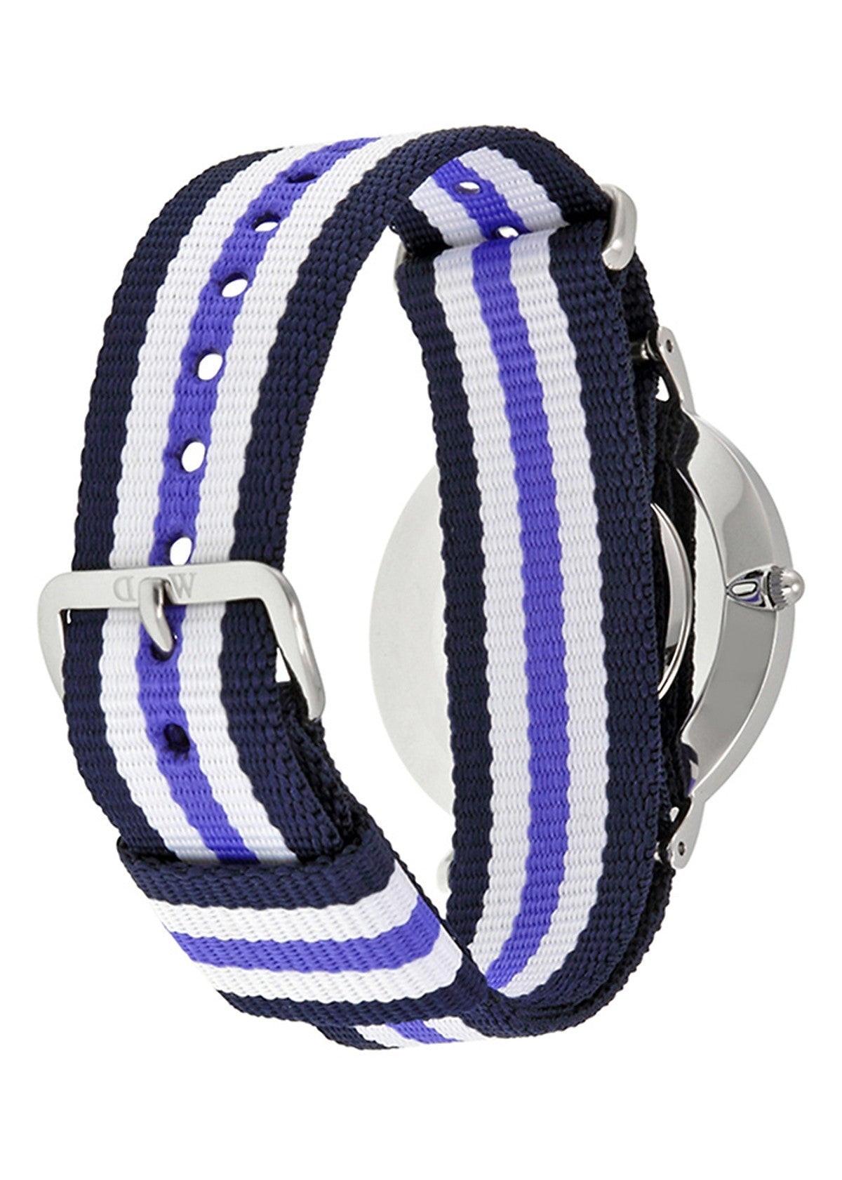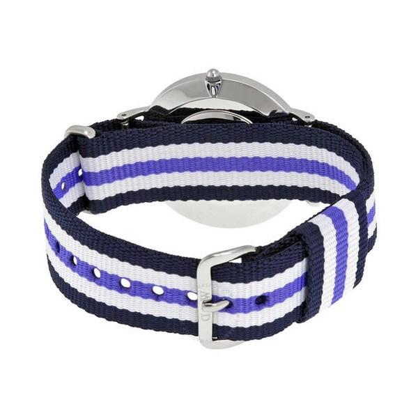 Daniel Wellington Trinity 36mm Women’s Silver Watch 0609DW comes in stainless steel case with a tri-color nylon strap. Fixed stainless steel bezel. with silver-tone hands and index hour markers. Minute markers around the outer rim. Dial Type: Analog. Quartz movement. Scratch resistant mineral crystal. Pull / push crown. Solid case back. Case diameter: 36 mm. Case thickness: 6 mm. Round case shape. Band width: 18 mm. Tang clasp. Water resistant at 30 meters / 100 feet. Functions: hour, minute. Casual watch style.