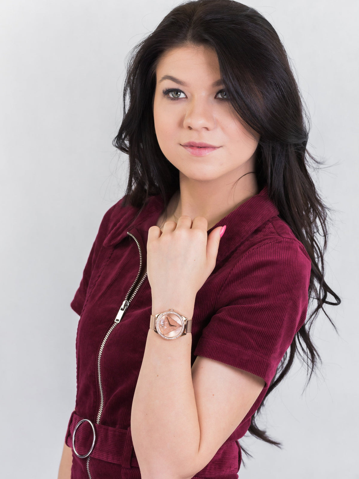 GUESS Ladies watch featuring a polished rose gold case with crystal detailing, sunray rose glitz logo dial and polished rose gold mesh bracelet, with adjustable G-Links. Stainless steel case, Stainless steel mesh bracelet, Rose gold dial, Quartz movement, Scratch resistant mineral, Water resistant up to 3 ATM - 30 meters - 100 feet