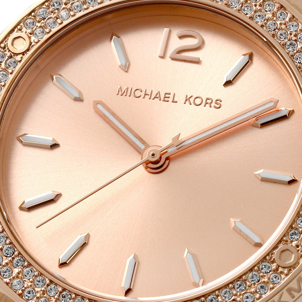 Introducing the Michael Kors Lennox Rose Gold-Tone Women's Watch, a luxurious timepiece crafted with sophistication and elegance in mind. This watch features a sleek rose gold-tone design and precise movement for the perfect blend of functionality and style. Enhance any outfit with this exclusive accessory.