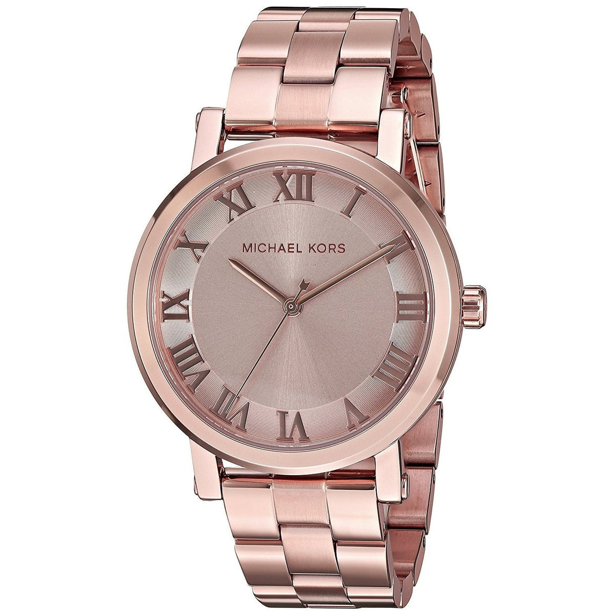 New for fall, the Michael Kors Norie watch effortlessly pairs a classic rose gold-tone three-link bracelet and case with a modern sunray dial. The etched index ring is set with Roman numerals for added style.