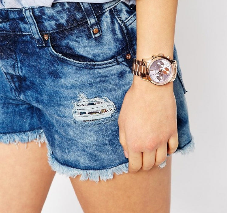 Rose gold-tone stainless steel case and bracelet. Fixed rose gold-tone bezel. Purple dial with rose gold-tone hands and index / Roman numeral hour markers. Minute markers around the outer rim. Dial Type: Analog. Date display between 4 and 5 o'clock positions. Chronograph - three sub-dials displaying: 60 second, 30 minute and 24 hour. Quartz movement.
