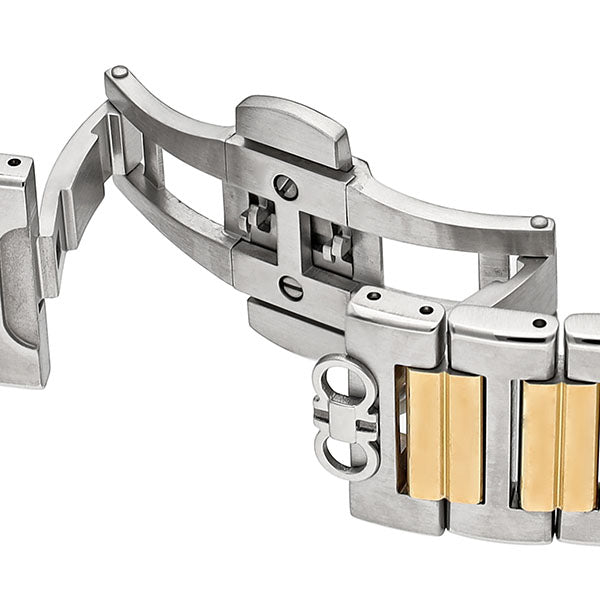 Lending a contemporary twist to an elegant design, this men's analog watch from Ferragamo is a must-have wrist essential. The blue round dial is protected by a sapphire glass. The stainless steel strap comes in a silver and gold hue that further elevates the look of the timekeeper. Besides, it is completed with a jewellery clasp with push button to ensure a secure fit on the wrist.