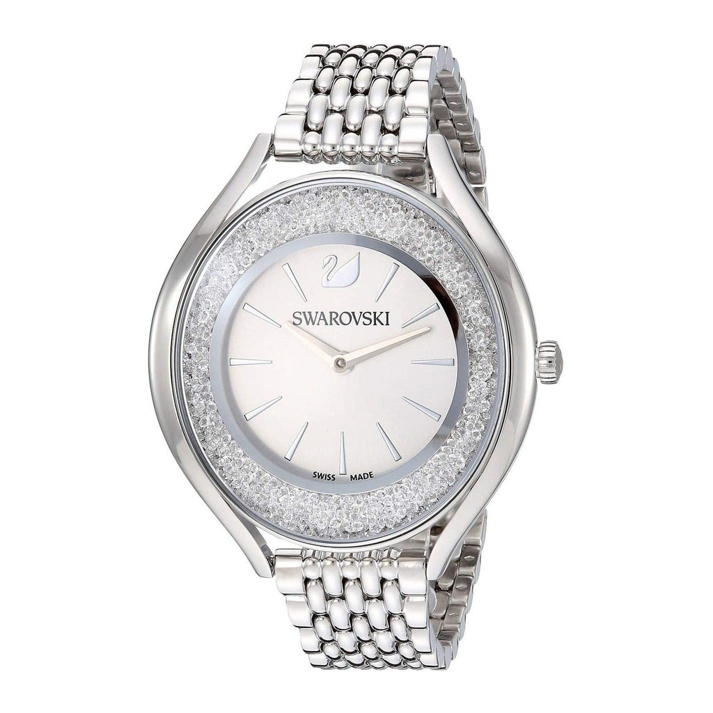 Eminently elegant, this Swarovski watch from the Crystalline Aura collection artfully combines form and function. More than 1,300 crystals in the stainless steel case create a brilliant sparkling effect. A stainless steel bracelet and a pristine tone dial with the Swarovski swan at 12 o'clock and stick markers complete the sophisticated design. This Swiss made watch is water resistant up to 50 m.