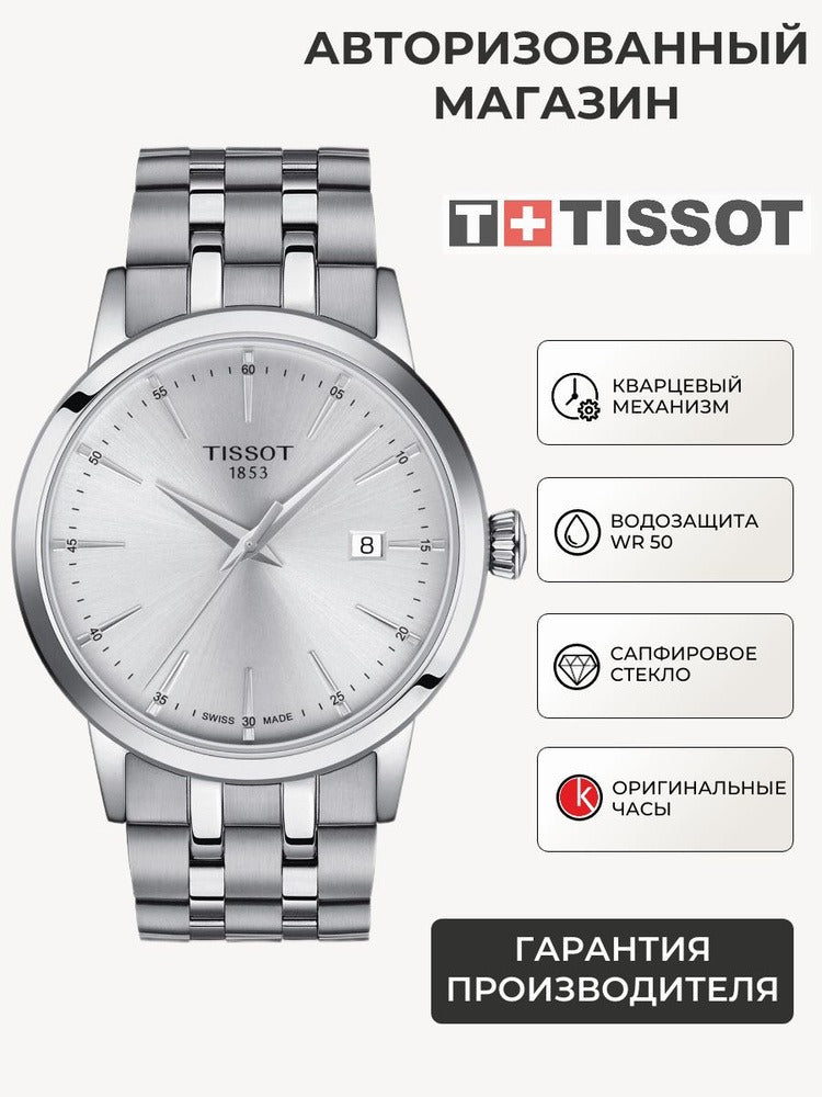 Silver-tone stainless steel case and bracelet. Fixed silver-tone stainless steel bezel. Silver dial with silver-tone hands and index hour markers. Arabic numeral minute markers (at 5 minute intervals). Dial Type: Analog. Date display at the 3 o'clock position. ETA Caliber F06.115 quartz movement. Scratch resistant sapphire crystal. Solid case back. Round case shape, case size: 42 mm, case thickness: 8.1 mm. Band width: 22 mm. Butterfly clasp. Water resistant at 50 meters / 165 feet. Functions: date, hour, minute, second, battery eol indicator. Classic Dream Series. Dress watch style. Watch label: Swiss Made. Tissot Classic Dream Quartz Silver Dial Men's Watch T129.410.11.031.00.