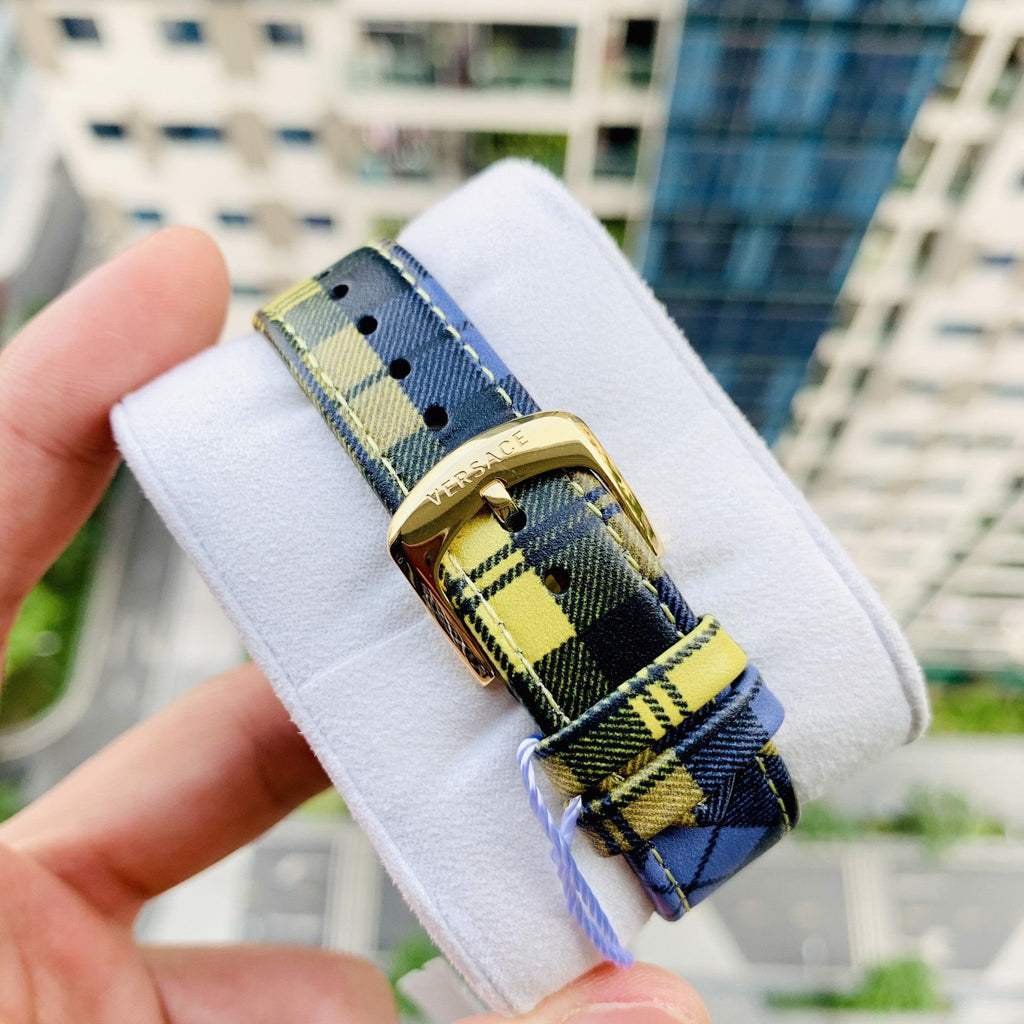 38mm – Two tone SS/ IP 1N, IPYG 1N round case. Vintage logo Versace on the dial and tartan leather strap