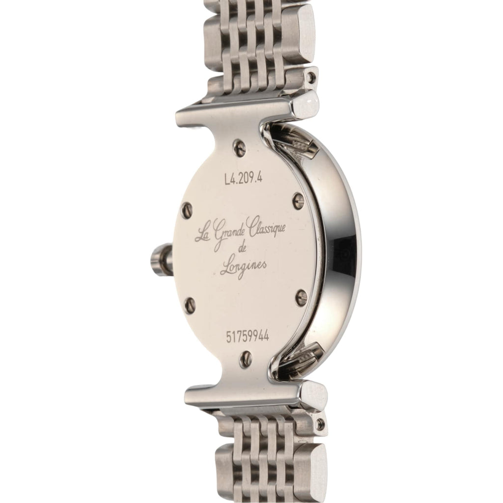 Stainless steel case with a stainless steel bracelet. Fixed stainless steel bezel. Mother of pearl dial with steel hands and diamond hour markers. Dial Type: Analog. Quartz movement. Scratch resistant synthetic sapphire crystal. Pull / push crown. Pressure fitted solid case back. Case diameter: 24.5 mm. Case thickness: 5 mm. Round case shape. Band width: 17.8 mm. Band length: 7 inches. Deployment clasp. Water resistant at 30 meters / 100 feet. Functions: hours, minutes. Casual watch style. Watch label: Swiss. Longines La Grande Classique Mother of Pearl Dial Stainless Steel Ladies Watch L4.209.4.87.6.