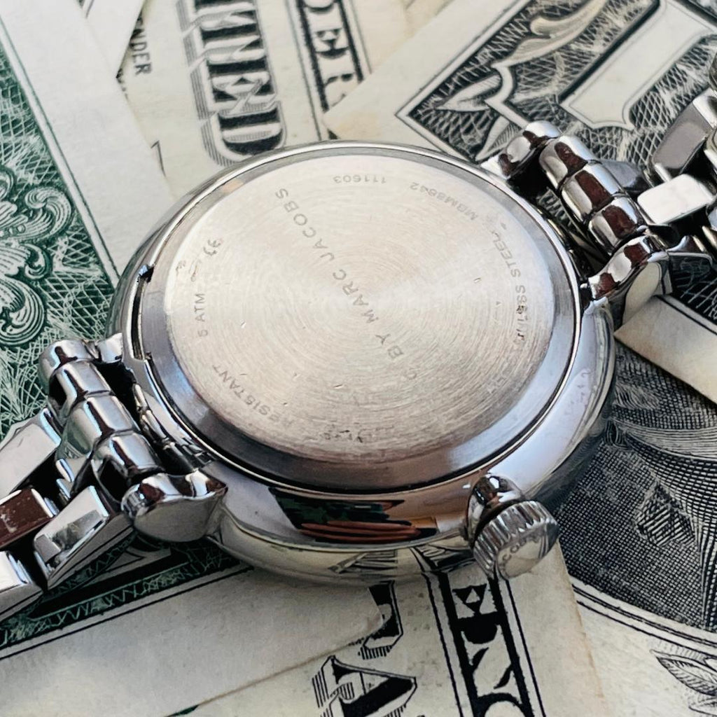 Stainless steel case with a stainless steel bracelet. Fixed stainless steel bezel. White dial with silver-tone hands and index hour markers. Dial Type: Analog. Seconds sub-dial above the 6 o'clock position. Quartz movement. Scratch resistant mineral crystal. Pull / push crown. Solid case back. Case size: 27 mm. Case thickness: 11 mm. Round case shape. Band width: 14 mm. Band length: 7 inches. Jewelry clasp. Water resistant at 50 meters / 165 feet. Functions: hour, minute, second. Casual watch style. Marc By Marc Jacobs White Dial Stainless Steel Ladies Watch MBM8642.| INFORMATION | |