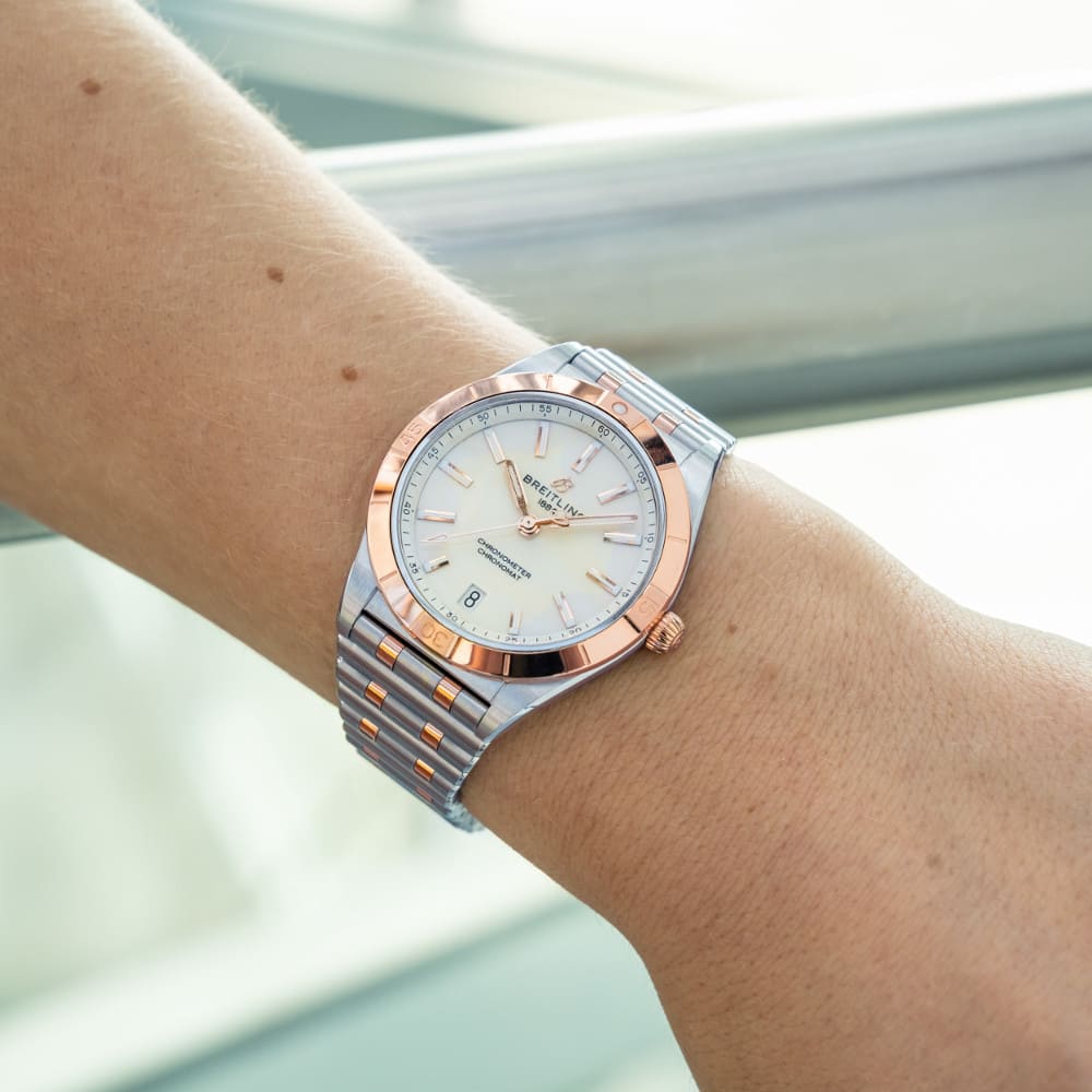 Stylish yet elegant, the modern-retro inspired Chronomat Automatic 36 is the versatile sporty and chic watch for any occasion. It is available in an array of metal cases, from cool stainless steel, to goes-with-everything bicolor, or even luxurious 18k red gold. Women craving extra sparkle will also be able to opt for diamond-set bezels, indices, and colorful dials. Featuring Breitling’s iconic and comfortable “Rouleaux” bracelet with a butterfly clasp, the Chronomat Automatic 36 is powered by the Breitling Caliber 10, a COSC-certified chronometer.