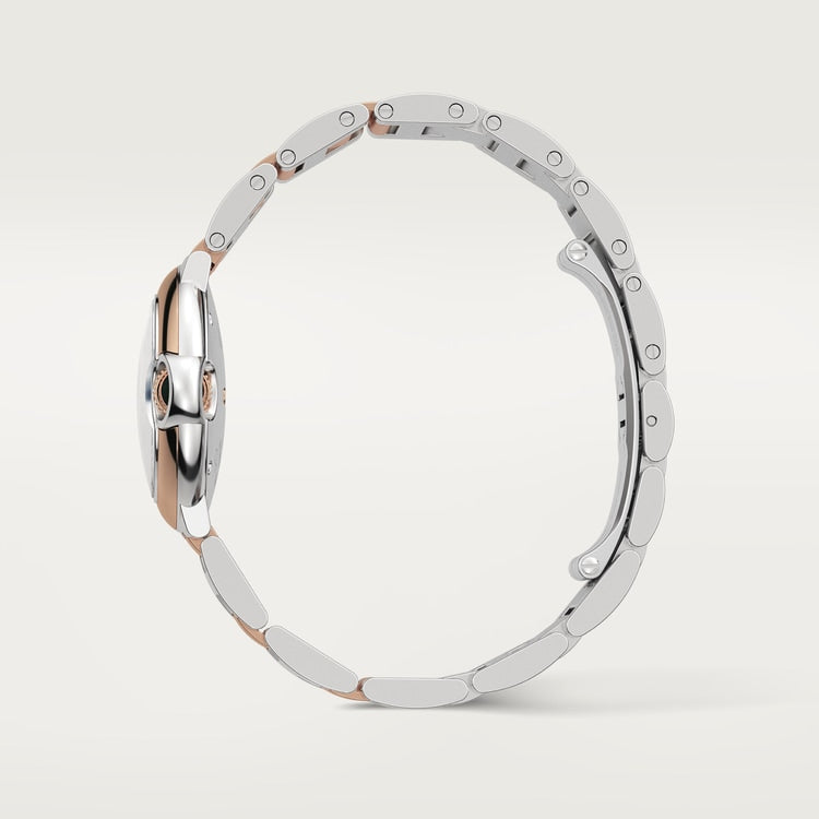 Ballon Bleu de Cartier watch, 28 mm. Quartz movement. Steel case, 18K pink gold bezel, fluted 18K pink gold crown set with a synthetic cabochon-shaped spinel. 12-zone flinqué dial, silvered lacquered sunray effect, set with 11 brilliant-cut diamonds totaling 0.05 carat. Blued-steel sword-shaped hands. Sapphire crystal. Interchangeable two-tone bracelet. 9.35 mm thick. Water-resistant to 3 bar (approx. 30 meters/100 feet).