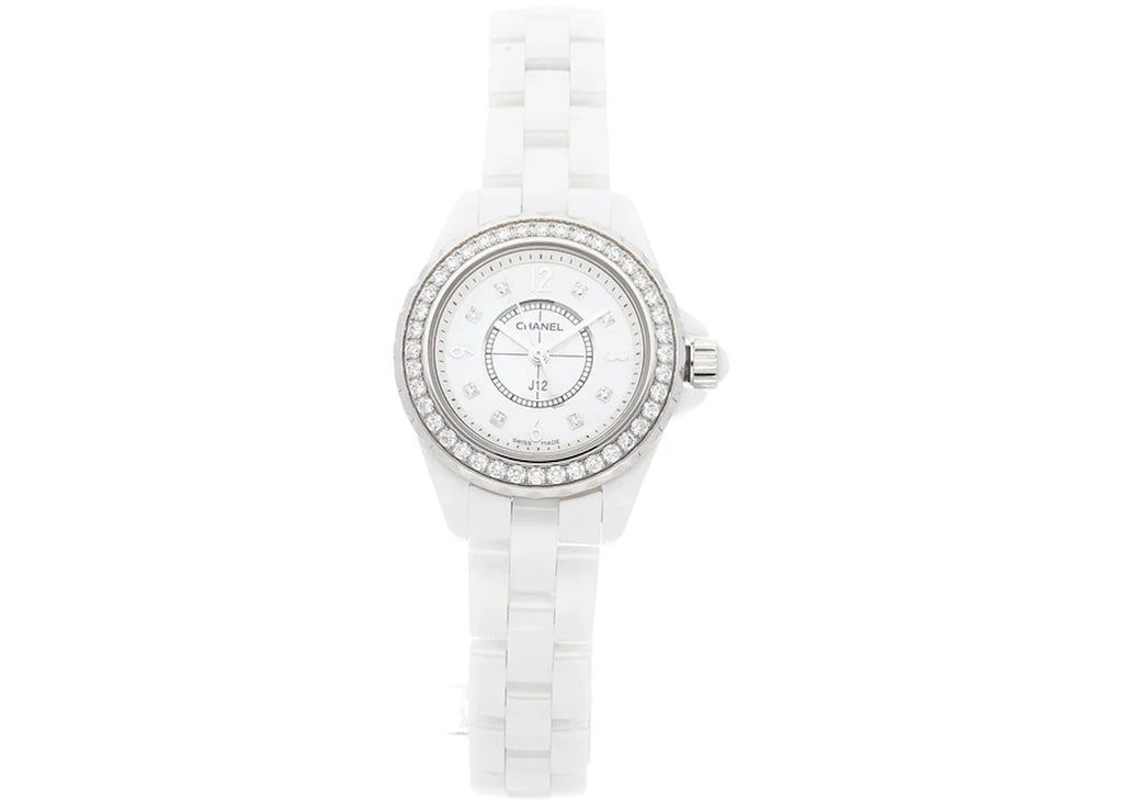 White ceramic case with a white ceramic bracelet. Unidirectional silver-tone bezel set with 40 diamonds. Mother of pearl dial with luminous hands and diamond hour markers. Arabic numerals mark the 6 and 12 o'clock positions. Minute markers around the outer rim. Dial Type: Analog. Quartz movement. Scratch resistant sapphire crystal. Solid case back. Case diameter: 29 mm. Case thickness: 11 mm. Hidden folding clasp. Water resistant at 200 meters / 660 feet. Functions: hours, minutes, seconds. Dress watch style. Watch label: Swiss Made. Chanel J12 Mother of Pearl White Ceramic Ladies Watch H2572.