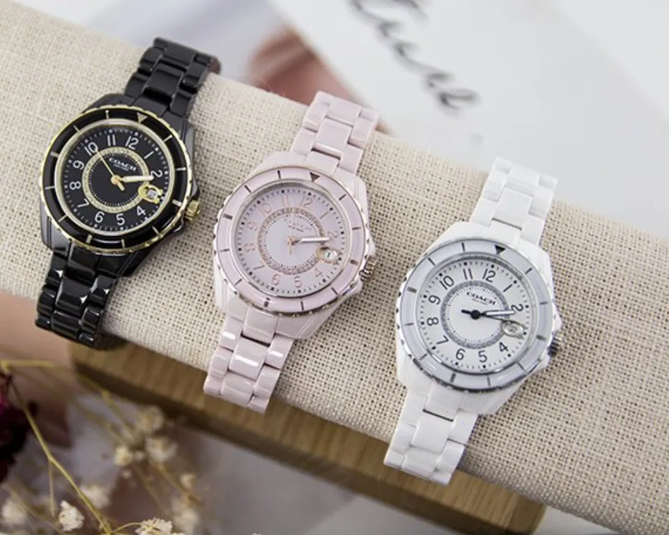 Quartz movement. Scratch resistant mineral crystal. Solid case back. Round case shape. Case size: 33 mm. Case thickness: 8.8 mm. Band width: 15 mm. Fold over clasp. Water resistant at 30 meters / 100 feet. Functions: date, hour, minute, second. Preston Series. Casual watch style. Coach Preston Quartz Black Dial Ladies Watch 14503461.