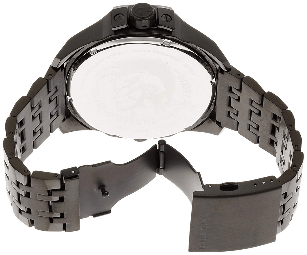Dominate the field in the black metal Diesel Uber Chief watch. The textured iridescent chronograph dial features applied blue iridescent Arabics with blue tracking accents.
