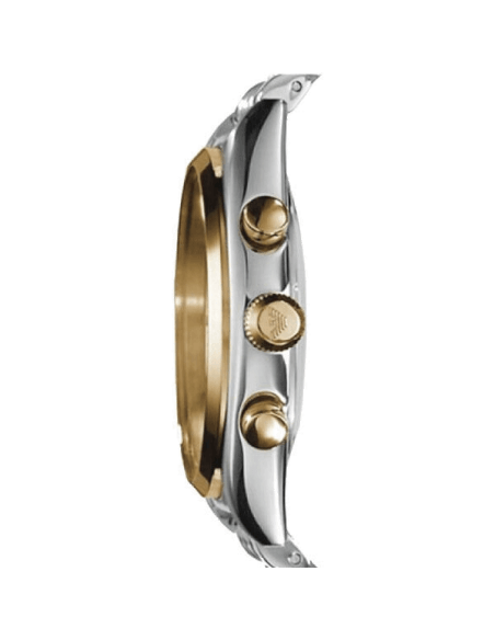 This clean-cut Emporio Armani men's chronograph showcases a gorgeous crisp white dial with gold detail and rim, and a stunning two-toned gold and silver band.