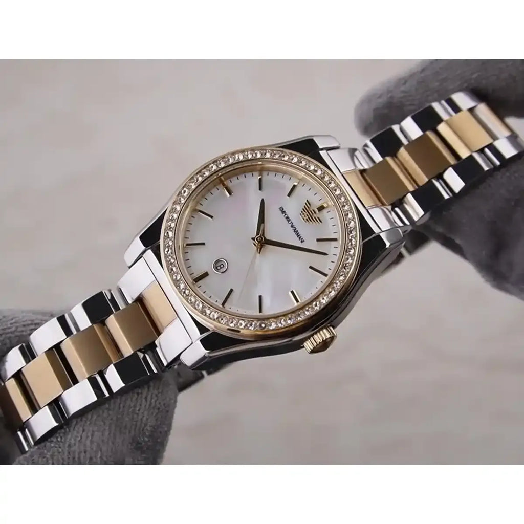 Armani Watch women's watch. Watch with 3-sphere quartz movement, made of stainless steel with round-shaped case with a mixed silver-colored finish. The dial is mother of pearl in colour. Case diameter: 32mm. Case thickness: 8mm. Lug distance: 16 mm. There are crystals on the bezel. The band is made of stainless steel, with a mixed finish. Strap colour: silver and gold. Band type: bracelet. Clasp: deployant. The water resistance is 5 atm. The reference is: AR11559.